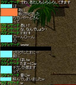 メンテ中に家事とブログ更新を目論見つつ昨夜の出来事を書こうとしているラディです。だって・・眠かったんだもん(´Д`)オットも待ってたしね!w ということで昨夜はGv終了後、うだうだ話していたわけですが。。クエでもするべ!ということで・・・サバイバルやってきました(〃∇〃)まずは装備はずしから・・でもね・・・Gv物資が余りまくってたので全部はずせない・・・結局鎧と手だけは装備で後ははずしてアルパスへGO!!アスヒWizの哀しきサガ・・・もうアスヒしたくてしたくて。。。(´Д`)ちなみに参加者は↓ ちなみにビショは疾風さんのキャラw死んだときのためにと出してくれました^^ありがとう(〃∇〃) その後は例の「生命の危険を感じる狩り」ですwまぁさくっと終わらせて一番乗り(〃∇〃) これで称号コンプかな?一部ちょっと後悔してるメインクエ系の称号もあるけどね・・・あ、あれだウルフマンのがまだだねwうん、たぶんサービス終了までとれないね(ぇw さてその後記念撮影をしたかったので赤いまま待ってみましたwりあるがミスってしまって削ってる図w その後途中参加のデジもあわせて無事に全員サバイバルを取得!サブキャラのカイトと疾風さんがメインに戻って記念撮影です♪ ちなみにフェンは・・・・かなり遅れてきたわけで・・・・・・wこんなやり取りが・・・wwwちょっち加工してみました(〃∇〃)ていうか・・・面白くなんて出来ないよフェン・・・orz その後はその場でうだうだと・・赤い人から戻るためにみんなにアスヒまくったわけですが・・りあるにアスヒをねだったところ・・・ 華麗にスルー(´Д`)さすがりある・・・・霧なんて要求してません!!!!! 無事アスヒしてもらってご満悦のラディ(あほ?w きりんに食べられそうになってみたり・・・・ まぁくだらない会話ではじけつつ盛り上がって1時過ぎに解散となりましたw途中反応のなくなったカイトw なんだか久々にあほみたいな会話をたくさんしたような気がします・・wソロでレベ上げもいいけどこんな過ごし方もやっぱりいいね^^