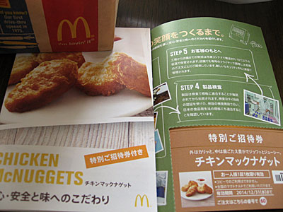 マクドナルドのチキンナゲットが復活!中国での期限切れ鶏肉を使っての製造が発覚して以来販売停止となっておりましたが、やっと復活!マックへ行った時にいただきました。まあ、無料なので次に行った時に貰おうかと思いますが、無料券付きチラシには、安全性を大々的にアピールしてましたね。それでも!1000人アンケートでは58.5%が無料でも食べないと!なんともったいない。ああいう事件の後だからこそ、安全には力を入れているはず。今は、安全です。2・3年後はわからないですが。明日はマックに無料券をもらいに行こう!