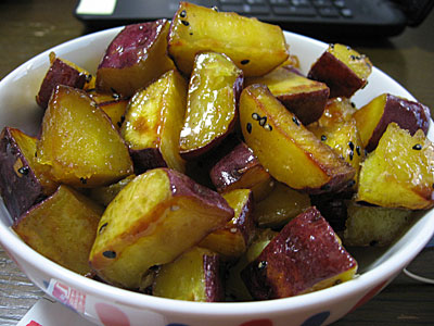 この粉を使えば、大学芋が簡単に作れる。今回の材料は さつまいも 3本(550g) 大学芋の素 1袋 油 大さじ3杯 水 大さじ2杯大学芋の素では、400gとなっているので少し量が多めですが気にしないこのぐらいの量は大丈夫です。作り方は簡単1.さつまいもを綺麗にあらう もらい物なので3本使いました。 さつまいもの季節は、いただくので買うことがない2.さつまいもを油で炒める 大さじ2杯のサラダ油で炒めました3.油を加えながら、キツネ色になるまでいためる。 10分ぐらいは炒めることになります。4.炒たまったら、さつまいもの素を入れ絡める。5.絡まったら出来上がり。 弱火でちょろちょろでOKです。簡単で美味しいです。焼き芋も美味しいですが、大学芋も甘くてやめられない。。紅はるか&安納芋 5kgミックス(洗い生芋)夢の食べ比べセット!さつまいも価格:2,980円(税込、送料込)>揚げない大学いもの素(50g)[調味料 たれ ソース]価格:108円(税込、送料別)
