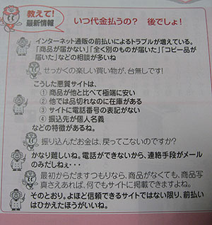 市役所から配られる市政だよりにこんな記事が注意書きが書いてあった。「いつ代金払うの? 後でしょ!」ちょっと古いフレーズですが、書いいていることは間違ってないんですね。ただ、後払いの通販ってあまり効いたことがない。後払いだと、通販会社の方がリスクあるんですよね。どちらかというと、払って貰えない場合が多い。この注意書きは、消費者目線の注意書きということですね。やっぱり楽天やAmazonでは、まあそう言う心配がないから、通販はやはり大手で買うのがいい。