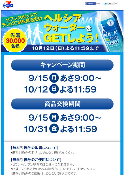 今度は、ヘルシアウォーターだ!セブンイレブン 7SPOT限定9/15 9:00~10/12 23:59 まで先着10,000名今回も無料でいただけました。最近、7SPOTの利用者を増やしてるんでしょうかね。7SPOT使っている身としてはありがたい。ヘルシアは、以外といいお値段しますし。実は、初ヘルシアなんです。商品の貰い方は 1.セブンイレブンのお店でセブンスポットにアクセス 2.「ヘルシアウォータープレゼントキャンペーン」 のバナーをタッチ 3.CMを見る。 4.CMが終わると無料引換券のバナーが表示されるのでタッチ。 5.画面に表示された無料引換券と商品をレジに持って行く。このバーコードを読みこんでもらうのですが、今回訪れた、セブンイレブンではアルバイトの店員さんがあまりわからない様でわざわざ説明する羽目に!結局、処理がわからない様で、『持って行ってください。』って大丈夫なの!後で怒られてもしらないよ!と思いつつも、店を後にしました。店員さんもこんなキャンペーン知らないんですよね。だから、まだまだチャンスありです。スマホ限定ですが、是非お早めにチャレンジしてください。