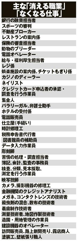 本日、近未来の恐ろしい記事が出てきました。こんなことが起こると、ますます就職難の時代が来る。便利になる一方で、過疎化が進む職業と無くなる仕事がある---------------------------------------たとえばバーテンダーの仕事。これがコンピューターに代わられる確率は77%。そんな大胆予測を披露した論文が全世界で話題だ。論文の執筆者が本誌に語った、凄まじすぎる「雇用の未来」。人の仕事がなるなる時代がくるぞ!「コンピューターの技術革新がすさまじい勢いで進む中で、これまで人間にしかできないと思われていた仕事がロボットなどの機械に代わられようとしています。たとえば、『Google Car』に代表されるような無人で走る自動運転車は、これから世界中に行き渡ります。そうなれば、タクシーやトラックの運転手は仕事を失うのです。これはほんの一例で、機械によって代わられる人間の仕事は非常に多岐にわたります。私は、米国労働省のデータに基づいて、702の職種が今後どれだけコンピューター技術によって自動化されるかを分析しました。その結果、今後10~20年程度で、米国の総雇用者の約47%の仕事が自動化されるリスクが高いという結論に至ったのです」人間が行う仕事の約半分が機械に奪われる―そんな衝撃的な予測をするのは、英オックスフォード大学でAI(人工知能)などの研究を行うマイケル・A・オズボーン准教授である。そのオズボーン氏が、同大学のカール・ベネディクト・フライ研究員とともに著した『雇用の未来―コンピューター化によって仕事は失われるのか』という論文が、いま世界中で話題となっている。同論文の凄味は、702の職種すべてについて、コンピューターに取って代わられる確率を仔細に試算したことにある。言うなれば、これから「消える職業」「なくなる仕事」を示したに等しく、これが産業界に衝撃を与えているわけだ。そうした「消える、なくなる」可能性の高い主な仕事である。いずれもコンピューターに代わられる確率は90%以上という驚くべき数字が弾きだされている。 オズボーン氏が言う。 「各仕事に必要なスキルはどのようなもので、そのスキルを機械がどれだけ自動化できるのかを、テクノロジーの発展のトレンドを考慮して詳細に調べ上げました。具体的には、コンピューター化の障壁となりうる9つの仕事特性を抽出して―たとえば、手先の器用さ、芸術的な能力、交渉力、説得力など―、702の職種を評価したのです。 これまでロボットはルーチン的な作業しかできないとされてきましたが、ここ10年間におけるロボットの能力向上は目覚ましいものがあります。ロボットが完全に人間の知性を手に入れるにはあと少なくとも50年はかかると言われていますが、その過程で、多くの仕事が機械の脅威にさらされることがわかってきました」 日本におけるロボット市場は直近では9000億円ほどだが、これが'20年には約3兆円、'35年には10兆円程にまで達するといわれる。 この10月に行われた日本最大のIT・エレクトロニクス見本市『CEATEC』では、人間相手にラリーをする卓球ロボットなどが披露され、来場者の度肝を抜いたばかり。最近では携帯大手ソフトバンクが、人間相手に会話をする世界初の感情認識パーソナルロボット『Pepper』を発表するなど、各企業のロボット開発競争は熾烈化している。 子供の頃に憧れたSFの世界が現実化する日が近づくようでワクワクする面もあるが、オズボーン氏が指摘するように、それは同時にロボットが人間の仕事を奪う皮肉な結果をもたらすのである。-----------------------------------------