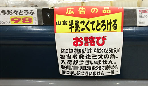 近所のスーパーでのお詫び文面担当者の発注ミスまで記載するお詫び分に脱帽通常なら入荷遅れで済ましそうそうな内容ですが、正直に記載する担当さんは偉いですね。商品がないのでどんなのか気になり調べてみました。半熟こくてとろけるこのネーミングからするとやわらかい感が伝わりますが、こんなのでした。ないとなると食べたくなる・・・一日の我慢です。。