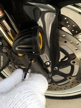 今日は本当に寒くて、昼前後に出歩いていたら、ポツポツと降ってきたと思ったら、カチカチという音になって、かるい衝撃も感じるように。あられでした。風も強くてとにかく寒い! 屋外作業にはとっても不向きな日。 だけど、ボルト1本の作業だからあれをやろう。 フォグランプの取り付けです。照射範囲、角度調整なんかは後日確認しないといけないので完了はできませんが、フェンダーに干渉しないかどうか、配線がどこまでとどきそうか、なんかはチェックできます。 昨日用意したボルト、ワッシャー類とフォグランプ一式をもってバイクに。寒いなー。 軽く締めこみ。スプリングワッシャーまではつぶさない程度でフェンダーとのクリアランスを確認。事前の測定では20mmオフセットスペーサーが良さそうでしたが。 大丈夫、まだ隙があります。いきなり確認しないで本締めしてフェンダーに接触してました、とかだと萎えます。 スプリングワッシャーをしっかりつぶして、本締めまで。真横からみるとほんと気づかないさりげなさ。 本締めしてもフェンダーとの隙は特に変化なし。この締め込みで緩んでくるかどうかは不明ですがひとまずこれで。 配線はどこまで届くんだろう。今日は配線作業まではやらないので、確認だけ。フォークに配線を留めて上までもっていきます。 リーチがちょうどステムの横付近。このあたりにUSB電源取り出しカプラが集まってるので、このあたりで集中的に配線をまとめられそうです。これにスイッチが入るのでもっとビジーになります。 多芯のカプラを使えばすっきりまとめられそうですが、1個1個故障したときの交換を考えると、ビジーになっても個別のカプラのほうがいいような気もします。 配線はしないので、本当に今日は仮組まで。角度の調整なんかはまた後日。ひとまずサイドビューを確認。 よし、横からだと全く目立たない感じでGOOD。イメージ通りです。 配線のほうが目立つという。 色味、質感が周囲の金属パーツ群とマッチするデザインのものを選んだつもりですが、良さげです。 だけど、前からみるとイエローリフレクターのアクセント。この辺はフォーク周りの色にも近いし、反射板を装備してる車種もあったりなので、脳内でも比較的違和感なく認識するオブジェ構成だと思います。 ということでとにかくさりげなく、フォグ、というかサブライトを装着したい、という構想は達成できたと思います。あとは配線、スイッチを仕込みますが、こんな寒いとやりたくないという。 ・・・。 春までダミー装着でも全然いいかもです。サブなのであえての1灯装備。この辺は非対称のほうが必要最小限の仕様っぽくて好みです。懸念は拡散仕様のランプだけど、タイヤ、フェンダーなんかも光を遮蔽するだろうし、フォグはともかく、サブライトとして有効かどうかは未知数ではあります。その場合でも2灯にはしたくないです。 ほんと今日は寒くて、写真撮るのもやめようかな、と思うほど。しばらくずーっと寒い予報だったので、走り納めも悩みますが、散歩くらいしてみて緩みなんかの発生有無をチェックしたいです。 残りは配線作業だけに特化したいので、取り付け角度の調整なんかはやり切りたいですが、寒いし、電源の確保もあるし、夜になるし、で悩みどころです。