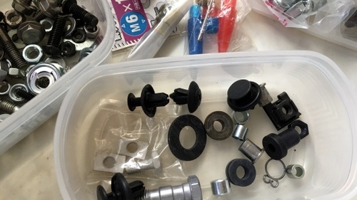 フロントフェンダーをとめているボルトにかまされている段付きスペーサーみたいなやつ。これがまさかの樹脂。樹脂だと力強く締め付けられないので、似たような金属スペーサーを探してましたが、近い寸法のやつは、ネットで探す限りPOSHから出てるやつくらい。 POSH製のやつも寸法はかなり近いんですが、材質がアルミ、ってのが微妙。これも柔らかいからどうなんだか。 ダメ元で手持ちの特殊ボルト、化粧ボルトの中から使えそうなやつがないか調べてみます。似たようなカラー、スペーサー、段付きのも数個見かけた記憶があります。 で、すげー似てる金属段付きスペーサを発見!すげ、ぱっと見いけそう。重さからしてアルミではないです。ナイス。 ノギスで厚みを採寸。純正のプラスペーサが5mmの厚みに対し6mm。ほぼ近いです。薄いよりは使えます。 フランジ厚が2mm。これは純正より厚いです。純正は1.5mmだったので。ということは首下は純正より0.5mm長いことになります。 フランジ径は純正プラがφ16。 見つけた金属スペーサーもφ16。これもOK。 だけど気になるのが相手物との接触面の面積。純正プラのほうは、プラということもあってか厚めに肉厚をとってます。約φ9.5。 それに対し、金属スペーサのほうは圧倒的に薄い、φ8.3程度。これだと力強く締めこんだ時、相手物が陥没しかねない恐れ。なんかワッシャーをかませた方がいいかな。だけどM6用のワッシャーでφ10程度のワッシャーって見かけない気がします。 ここのカウルの径はいくらなんだろう。ここを通せるワッシャー径を調べます。ノギスでは形状が悪くて測れないので、手元にあったワッシャーを通して径を探ってみます。 手元にあった一番小径のM6用のワッシャー。外径φ12。これが通れば一番手っ取り早いんですが、残念、通過せず。 M6用じゃないけど、外径がφ9.8くらいのワッシャーは通りました。 ということは外径φ10のM6用ワッシャーが必要です。 調べると・・・、あります。もちろんワッシャーとしては高いけど、相手物を陥没させたりするのは嫌なので用意しようと思います。 今回発掘したスペーサーはもともと首下長さも少し長いし、これから探すけど、小径ワッシャーをかませると、さらに首下長さが純正より長くなる方向に行きます。ここが長くなるとその分、カウルとスキが出てくるのでカウルの締結、ガタに関してはよくない方向です。金属にもなるし、ここのスキ調整用にはゴムかプラスペーサーが良さそうです。 薄いゴムシートが工具箱に余ってたからゴムスペーサーくらいは自作するかもです。 何のバイク用のスペーサーだったか覚えてませんが、ほぼズバリのサイズ、材質のものがあったなんて。POSHのスペーサを買わなく済みました。 オフセット用のスペーサーは手元に届いたし、あとはこの浮いたお金でアレを買って・・・。値段的に本末転倒のものを用意して取り付け用の材料調達はクローズできそうです。