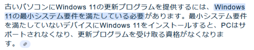 先日Windows11に更新した第3世代のCore i5マシン。何の問題もなく動いてます。仕様を満たしていないパソコンは更新プログラムを受け取る資格がなくなる、って以前ネットで見ました。 だけど、Windows10のときと同じ感じで更新プログラムの適用があります。これはどういうこと? 今だけのことなのかもだし、突然更新が来なくなることは十分あり得ます。けど、更新プログラムが来る間は様子見できそう、と判断。 ということで子供のゲーミングマシンもこっそり夜にWindows11にします。新しいのに換える?って聞いてもやっぱり、今の自分の端末がいいようで。なら無理に奪わなくても今はいいかな、と。 STEAMとかいろいろ入ってるけど、バックアップ?いままでトラブルになったことがないので、そのままもろもろ引き継いでインストールします。 エントリークラスだけどスペックは我が家の中では随一の子供のマシン。自分のマシンの時より早く更新が終わりました。 無事24H2に。 HDDの暗号化もされてないし、 そもそも暗号化の設定が出てきてないので、適用外のパソコンなんでしょう。 数時間放置してたら、更新の準備ができたとのいつものお知らせが。やっぱり更新案内が来てるようです。 うーん・・・、更新プログラムを受け取る資格がない、と聞いていたので新しいパソコンを買わないとな、と思ってたけどこれはいったい。でも正式対応じゃないので、いつなんどきMicrosoftの塩対応、罠にはまるか、です。 いうならナイナカードみたいに、受益者の声は関係ないので。レガシーが残ってると先には進めないので、サプライヤーからすると嫌なのはわかりますがOSを人質にされるのは気持ちよくないです。 ゲームとか動画再生とかして数日様子をみてもらってるけど、今のところ不具合なし。 一般ユーザーが物理端末を使うのがダメなのか。みんなで仮想マシンのほうが、ユーザーもサプライヤーも管理が楽な気も。なんかそういう路線の切り替えが必要なのかもです。とりあえず古いパソコンで何が起こるのか、様子見です。