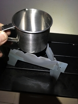 少し前にしてた火遊び。火力の点ではなんとか目途がついたアルコールバーナーですが、五徳の形状に問題が。 自分、キャンツーでコーヒーを飲むときは計量カップに水を入れて直火で沸かすんですが、五徳の隙間にカップが落ちるんじゃないかと気になってました。 実際に五徳の上にカップを置いてみると。案の定、ぎりぎり。ちょっと置く位置を間違えたら崩れます。火のついたアルコールに水が入って、流れ出るなんて炎の流出、インシデントです。 ということで、何か敷くものはないかな、と探していて、ダイソーでよさそうなやつを見つけました。四角の焼き網もあったけど、スリムなほうがいいかな、ととんかつ用の敷網を選びました。 これを五徳の上に置くと、浮かせるための突起が五徳とうまくフィット。ずれ防止になってくれそうです。 安定しているので安心してアルコールバーナーに着火。 水の量が少ないので沸き始めると一気にぐらぐらっときます。火傷したり、あふれて下のバーナーにこぼれないか不安になりますが、なんとかこの量なら大丈夫そう。 時間は3分ちょっと。許容内です。 なんとなく火力が弱いと思ってるけど金網なんて軽く赤銅色に持っていく熱量は持ってそうです。この上でなにか焼いたらおいしそうだけど、メチルであぶった食べ物は気が引けます。 これでコーヒーも沸かせそう。 これまでのトライでわかったことをまとめます。ライスパックを15分くらい温めるのはギリギリか。沸かすのに蓋をして8分、温め15分だと23分。マニュアル通りだとアルコール100mlで燃焼25分です。これは1回の満タン量です。 他、ラーメンを朝晩2回とすると、沸かすまで8分、煮るのに3分。それを朝晩2回で22分。これも約100ml。 あと、ハムとか焼くのに・・・、10分、コーヒーを3回沸かすとして10分。計20分として80ml。 アルコール量は500mlまでは不要そうです。ちょっと余裕をみて350mlくらいが自分の1泊ツーリングでは必要な量かもです。季節、外気温、風の有無にもよりそうだけど初回は350mlくらい携行してます。 ・・・。 1回くらいライスパックを温めてみるのもよさそうです。