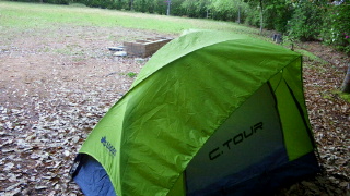 夕方、キャンプ場に着いたのですが…、うわっ、誰もいない…。夜、怖いです…。小雨のうちにテントを建ててエスケープです。いつも思うのですが雨でも、結構テント内は快適で驚きます。