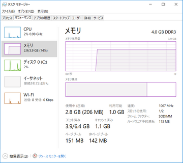 もしかしたらHDDを換装されてるのかもしれませんが、まあそれでも新しいです。でも、何気にメモリの使用率をみたら結構高い!Windows7のときより1GBは多く使ってるんじゃないでしょうか。このスクリーンショットだと少ないですが、なにもしていなくてもディスクアクセスも30%あったりします。