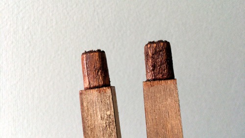 出かける前に少しいろいろ確認。まずは昨日のニスの具合。結局2回塗りました。ひと晩経ったので結構カチカチ。毛羽まで逆立って痛い感じです。ニスを塗ると、仕上がりの悪い部分が目立ちます。