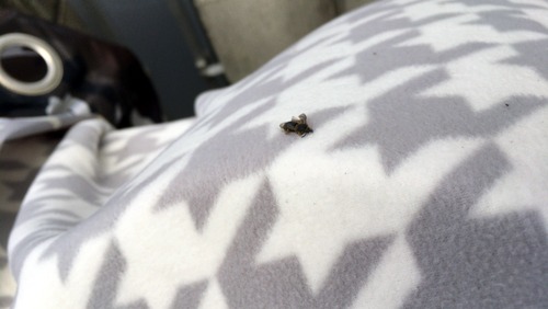 バイクカバーを開けると、スクリーン養生用の毛布の上でハチみたいなのがつぶれて死んでました。グロイ・・・。裏からはじいたらきれいに取れたのでひと安心。変な汁が出てなくて良かったー。