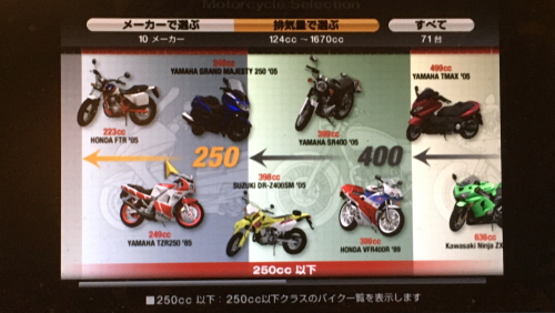 昔のゲームなので登場バイクも旧め。ただ、ありがたいことに自分の世代としては懐かしマシンがずらりです。