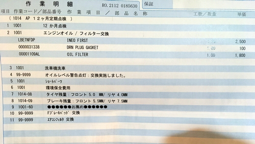 オイル警告灯が出ているので、何か問題がないかの確認はおねがいしました。他はオイルとオイルフィルターの交換をお願いしました。
