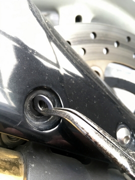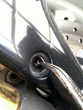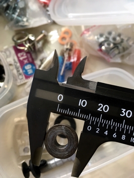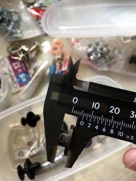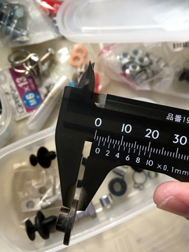 ここのカウルの径はいくらなんだろう。ここを通せるワッシャー径を調べます。ノギスでは形状が悪くて測れないので、手元にあったワッシャーを通して径を探ってみます。