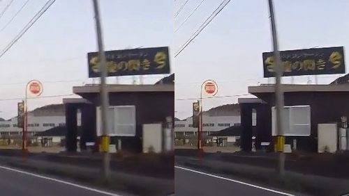 左が補正なし。右がAI補正。看板の文字もそうだけど、建物の窓枠とかのエッジもくっきりはっきり。電柱の虎帯もくっきりです。