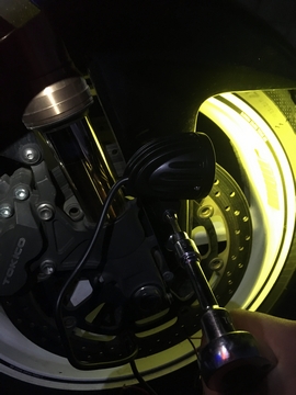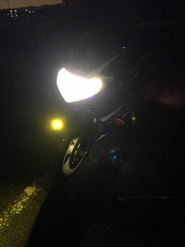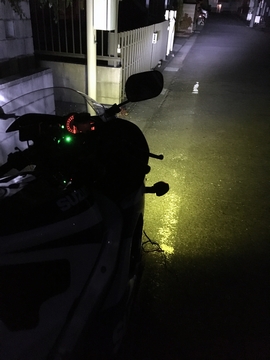 バイクを引っ張り出して、あれをやります。フォグランプの点灯と照射角の確認。