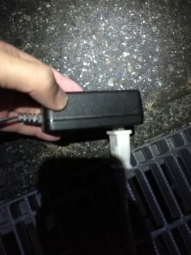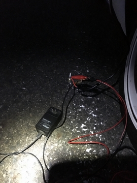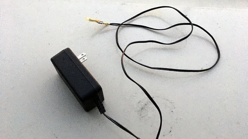まだスイッチを取り付けていないので、バイクから電気を取ることができません。だから12VのACアダプターを使います。宅内ではいろいろカーアクセサリーを転用して使ってるので12VのACアダプターがたくさんあります。これは車載用モニター用の電源として使ってたやつ。