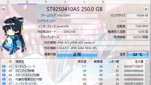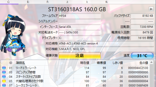 CrystalDiskInfoでみるとOSのHDDがイエロー。不良セクタが出かかってる。160GBのHDDだなんて、どれくらい前の普及ゾーンなんだろう。Cドライブが不健康なのは気がかり。