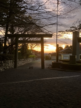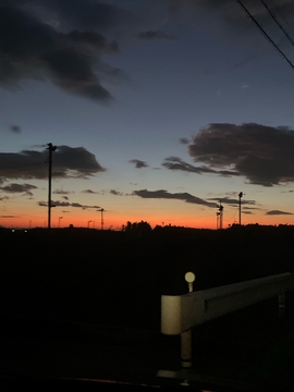 椿さんの手前で空が朱てきました。木々のスカイラインもきれい。道端に停車してパチリ。