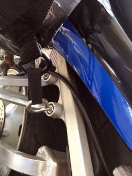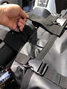 サイドバッグ下部のDリングと増設したラゲージフックを面ファスバンドで固定。車体側にひきつけます。