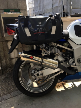 車両前方を下に引っ張ったので、相対的にマフラー付近が上昇。これでマフラーとサイドバッグの隙を確保することができました。