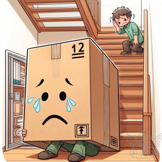 階段が次のハードルです。Copilotさんに狭い階段を大きな箱を下せなくて困ってる画を描いてもらったら・・・、もう下に降りてて問題ないやつ。はやくこんな感じでいいので降ろしたいです。