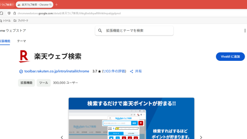 で、一番心配だった楽天ツールバー。ダメ元でアドオンを導入しようとサイトに行ったら、一瞬Chrome用の表示が見えて、Vivaldi、と表記が変わりました。ちょっと調べると、Chrome用が使えるようです。メジャーどころを転用できる仕様はクレバー。