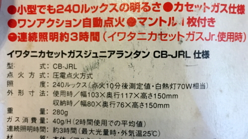 そんなランタン。ボンベ1本でどれくらい使えるんだろう。箱書きをみると小さなジュニアガスで3時間とのこと。