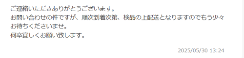 これはいよいよ怪しいな。再度確認したら、一応レスポンスはあって。3週間も到着ありきのコメントは胡散臭い。
