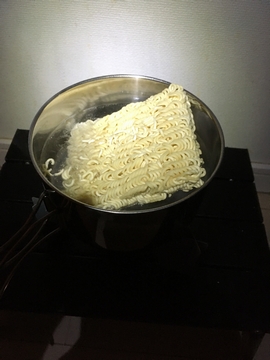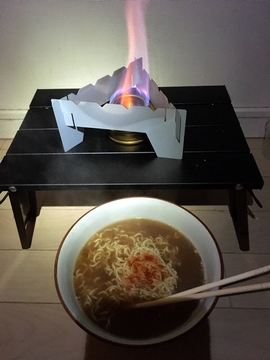 じゃあ、袋ラーメンを作ります。入らない?いつも棒ラーメンなので曲げて入れるんですが、四角はやめたほうが無難。箸で押し込むと五徳の足がずれてテーブルのスリットに落ちるんじゃないかと冷や冷やします。