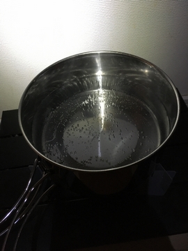 10数分経ったけど沸いてこない。これは五徳が低すぎか?ヒートポイントはもう少し上だと思います。少し持ち上げると一気に鍋底の気泡が増えて、やっと沸き始めました。
