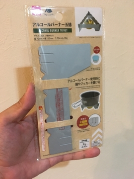 メジャーなアルコールバーナーは五徳セットのやつもあるけど高くなります。だけどダイソーにはアルコールバーナー用の五徳があります。大小の2種類あるけど大きいほうをチョイス。110円です。