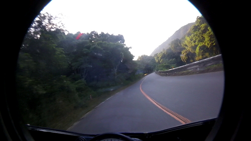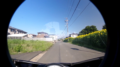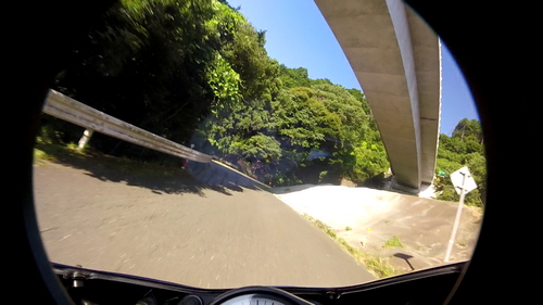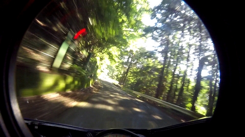 おっと、このコーナーは深め、大丈夫かな。ミラーで見ると・・・、なかなか寝せてるな。初手から寝せるとマージンがないので怖いな。