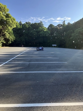 酷道パートを抜けて平地に。7時前に目的地の神社に到着です。広い駐車所、貸し切りです。