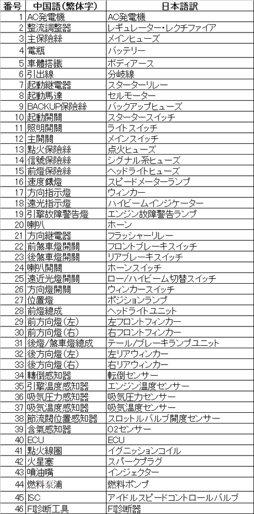 だいたい想像できる文字もあるし、配線図のなかのどこで使われているデバイスかで、日本語ではこれかぁ、ってところまでは予想できます。でも、やっぱり反証というか、中国語でもなんて書かれているのか、その意味も確認してクロスチェックしたいところです。