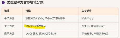 そうかぁ、さっきのあの子の言葉は愛媛の方言か。ちょっとCopilotさんに聞いてみたら愛媛の方言にも数種類あるみたい。聞いた感じ、これかな?
