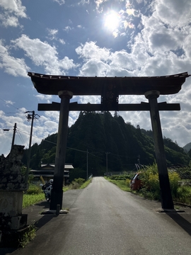 鳥居がデン!奥のご神体とされるピラミッド形状の山、参道、鳥居、逆光がゆえにまばゆい太陽に、それを取り囲むような白い雲。空の青ささえ霞むような、日輪!
