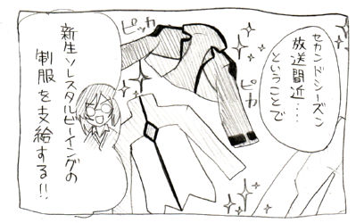 ぅぉおおおお!!!!!!!!!こっち全く更新してなくてスイマセン…!!!!!!!行方くらましてる間に「GO!GO!5!FES‘08」に行って盛り上がったり旅行したりなんやかんやしてました(人でなしだー!!!!)卒論…orz(オイ)最近は00の二期が待ち遠しくて死にそうな感じです…待てるか!!!!!!!!ギアスはなんかもうワケワカメで正直ついていけません。まぁ割とR2始まった当初から引き気味でしたが…最近は設定出したのに使いどころに困って一掃されるキャラが多かったりとかね。好きだったからこそこの展開にイラッ☆とくるんですねー。イラッ☆ さて。2期が楽しみ過ぎて描いた4コマ漫画投下↓ 三人「もしくは千葉道徳。」テ「確かにそうだけど!!まぁ間違ってはいないむしろ正しいけど!!!」 仲間意識が超増したティエリアが、統一感のある制服を作ったと信じてやまない。ってwww刹那ちっさすぎwwwwwww コメント返信など、…こ、今月中にはしますので!!!あ、2期放送始まったら楽天ブログをやめようかなと。違うブログで新しくもそもそやろうかな?と思ってます。 おまけ。 4コマ目、本当はコッチだったっていう。ティリアどこ見てんの?wwになったので変更しますた。どうでもいい。