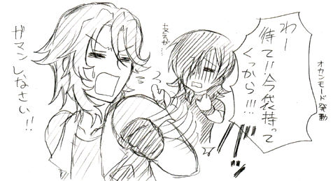 久し振りに絵板で描けるようになったので描いてみた(何かセキュリティの問題でこないだまで描けなかったからねー) 早速ティエリアな。最近のティエリアは録音兄貴にデレ過ぎだ!!!!しかも今月のアニメージュの表紙、兄貴と二人で飾っててビビッた。あれっ主人公は刹n(言うなwwwww)どの雑誌見ても ティエリア→録音ですよね。何だコレ。一体何がどうなっているんだ(笑)私的には…ヴェーダという依存対象とリンクできなくなってショックを受けたティエリアを励ます兄貴はもう母親的存在に見えるのではないか、と!!!!そもそもマイスターズでの立ち位置は母親だからなwwwwwww兄貴なのにwwwだからティエリアにお母さん言わせてみた(えッー)