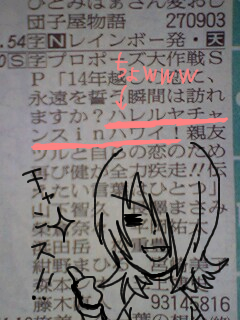 キラキラさせすぎたwwww(笑) てかまた更新がこんな時間に…渋滞やら何やらで遅くなった&買い物してたので…明日も明後日もちと出かけるので、またこんな感じの簡単な更新のみです…スイマセン;しかもOOしか更新してないwwwwwそろそろ戦ムソもまた描きたいwwww某にこやかな動画でキュンキュンしてるので(笑)