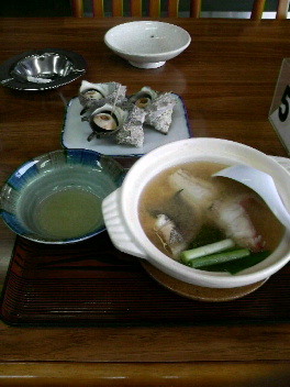 灯台のふもとの観光店で昼食がてらいただいたのが、サザエの壺焼き3つで500円とざっぱ汁500円。