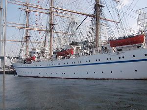 日曜日は、10時船集合で、沖に出ました。ハーバーに着いて、出艇申告をしていると、先輩方がやってきました。出艇申告というのは、「どの方面に行きます」「何時ごろ出発します」「何名乗っています」「緊急電話番号はこれです」というのを、申告することです。そして帰ってきたら、帰着の申告をしておきます。山での遭難ではありませんが、もし予定の日に帰着がなかったら電話などでハーバー所属艇の安否を調べます。船の用意をしながら、「何処に行く?」「西?東?」と・・・まあ皆さんOFFの日の息抜きですので、何処でもいいのです。燃料でも入れようか、ということでハーバー内のスタンド桟橋に船を動かし給油しました。結局、USJと海遊館に行くことにしました。風が弱いので、エンジンを動かしながらの帆走です。甲子園と防波堤の間を抜け大阪湾にでます。大阪湾といっても、埋め立て島がいくつもできて、すぐに陸地が見えます。かつて計画された大阪オリンピックのメイン会場になる予定だった舞洲という埋め立て島が正面で、方角的にはその向こうにUSJがあります。舞洲とその南の咲洲という埋め立て島の間の橋の下がくぐれるか?その広い水路の水深は十分あるだろうか?14mほどのマストと3m弱船のそこから出ているキールという錘がクリアできないとあきません。ヨットというものは不便なものです。でも荒天になった時は、これが威力を発揮します。同じぐらいの大きさのモーターボートでは、波で左右に揺れて怖い海面でも、ヨットは一定方向から風を受けて進むので、傾いてはいますが安定して走れます。重い錘がぶら下がってるキールがあるので、たとえ横倒しになっても、起き上がりこぶしのように、必ず立ち上がります。ととても安全な乗り物なんですが、高さのない橋の下はくぐれないし、浅いところも底が当たって通れません。咲洲の向こうを回って行くことになりました。島の角には、ランドマークがあったり、小さな灯台が設置されていたりします。昼間は特に必要ありませんが、夜はこれほど頼もしいものはありません。常に水深計をオンにして、その角を回ります。水深計をオンにしていると、適当な間隔で、現在の水深を表示します。これがどういう間隔なのか良く分からないのですが、十分深いところでは、中々表示せず、浅くなってくると頻繁に表示するような感じがします。咲洲をまわり、大阪北港の灯台を抜けると、右手に海の科学館の銀色のドームが見えます。海上から見ると、海にドームが浮いているような感じに見えます。左手は、コンテナを船に積み下ろしするコンテナクレーンが数本立っています。色も黄色だし、きりんさんのようです。大阪港の積み下ろしは、大阪南港の方に主力が移っているし、10マイル西には震災までは日本一の積み下ろし量だった神戸港もあります。きりんさんが寂しげです。海の科学館の横を通り過ぎると、正面に海遊館の独特の建物とその横の観覧車がはっきり見えてきます。更に近づくと、海遊館の周りにお客さんがたくさんいるのが見えてきます。どうやら遊覧船のサンタマリア号に乗り込んでいるようです。サンタマリア号は、海賊船のような形をしています。色も暗色だし、海賊船をイメージして作られているようです。サンタマリアの前に、大きな4本マストの船があります。こりゃ練習帆船のようです。海というより、河口という雰囲気になってきたので、ここでセールダウンです。更に近づくと、ちょうどサンタマリアがちょうど出発します。その御尻を追いかけるようにUSJの方に川をさかのぼります。4本マストの帆船は、日本丸でした。ここで日本丸とご対面とは、ついているかもしれません。大きいです。前に回ると、この船を守る女神かな?の像が付いていました。USJはこっちから見ても、何も面白くありません。再び海遊館の下ってきて、海遊館横の桟橋に着けられるか偵察です。前はおんぼろ桟橋があったようですが、商業桟橋と水上警察の桟橋しかありません。こりゃ、あかんみたいですが、船が停まってないし、接岸して聞きに行くことにしました。しかし、やっぱりダメで、艦載戦闘機のタッチ・アンド・ゴーのように、もやいを取ったと思ったら即出発になってしまいました。予定では、ここで何か食料を調達する算段だったのですが・・・