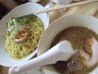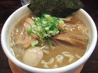 名古屋に用事があり、ついでに千種駅のそばの、「ら・けいこ」の関係のラーメン屋さんへR(富良野かな?) 名古屋市千種区今池1-1-4つけめん汁なし専門とあります。常連には、写真撮らせるけど、一般人は禁止という、おじさんには理不尽だと思えるお店禁止と書いてあっても、あえて「いいですか?」と勇気を持って聞いた人には撮らせてあげようねどうせ、常連には撮らせて宣伝させてんだからねロイマさんが行って、食べられなかった特製汁そばを注文、850円外見は、味噌らーめんってくらい赤茶色のとろとろスープですが、啜ってみれば(啜らなくても、顔を近づけただけで、魚粉たっぷりガツン系と判る)魚介節系に、濃厚豚骨醤油を合わせたような味と香ですポタージュスープに、味噌と醤油混ぜた感じです。メンマは醤油のきつい、長細い、ざくざくと歯切れの良いメンマです。チャーシュウは、ちょっと変な香がする、なんか昔こんな匂いや食感の缶詰、そうそう、鯨の赤身の缶詰の匂いだがする麺は、いいですね~色はかなり濃い目の黄色ですが、極太やや縮れ麺で、ら・けいこの硬い麺ではなく、くにゅくにゅ柔らかいけど、腰?ウンブリケッリみたいな食感を強くした麺が美味しいです。カウンターに、一味唐辛子と花椒が置かれ、がんがん使えと、給水器の横に張り紙してあったので、一味をがんがん入れたらでした。強烈な一味です注意してください煮玉子が無いのが残念です。薄味の半熟煮玉子とご飯が在れば、スープと一緒にグチャグチャにして食べたら絶対旨いと思うな