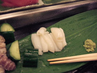 昔、「僕、タコの赤ちゃん~」って、TVCMが在りました。知ってる?ソニーのCMだったかな~ おじさんの好きな寿司種のひとつに、烏賊があります。それがこれ墨烏賊の赤ちゃん、新いかです。コハダの新子が無くなって、大きくなった今時分、アオリイカと代わって、墨烏賊の登場です。隣の胡瓜の大きさと比べてください。可愛いでしょ?これで、もう、ちょっと大きいかな?でも、これくらいの、味と歯触りが、おじさんは大好きです新いかはね、噛み心地が柔らかいんです。でも、歯が、烏賊の表面を破る時に、「プッ」っていう僅かな抵抗があるんです。そうそう、瀬戸ジャイアンツの皮をもっと薄くした感じで、「プチッ」とも「サクッ」とも「スッ」とも違うの 「プッ」なんですそして、肉質は、「ねっとり」でも「むっちり」でもなく、「はかない」んです。でも、「軽やか」なんです。頼りなさ気に、溶けて酢飯と一体化していく「潔さ」が「清純」なんですおじさん、そんなにロリコンではないんですが、(そんなにって怪しいけど)新いかはね、小学校高学年から中一までの、穢れを知らない女の子の耳たぶです。羽二重餅のような耳たぶですそっと噛むと、言葉が発せられず、ただ首を振って、いやいやをする、そんな女の子の耳たぶです ホラっそこのおじさん、食べたくなったでしょ