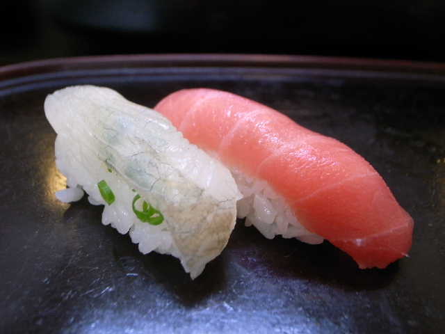 日曜日、勉強会の後、よしながさんと大曽根のお寿司屋さんへ「穴子と光物が主」と謳う寿司屋さん期待大で、予約の電話をしたら、当日予約では寿司種が少ないこと、穴子は既に売り切れ、それでよろしければ、と成りました。7人も座れば満席のL字型カウンターに座ると、口卑しい飲ん兵衛用に、さっと、枝豆とインゲンの胡麻和えのオツマミが出てきました。まずは、で乾杯です。暖簾で隠れた調理場に入ったと思ったら、松茸の汁もんが出てきました。松茸が、こんなに素っ気無い汁もんは初めてですが、これはこれで在りだね 宮城の超辛口ですが、コクも在って旨いこれは酔います写真撮り忘れましたが、赤身、白身、イカのお造りが出てきました。おじさん、後から寿司を食べる時は、切っただけのお刺身は本当は遠慮したいな~茹でたり、焼いたり、煮たり、炊いたりしたモンは歓迎ですが 焼印入れなくても、宿木さんで、寿司を食べてる事は判ってますから普通に冷たい出汁巻き玉子 鮎の炊いたンを頭から丸ごと潰して・・・・・・わざわざ潰さなくても、姿のままの薄味の甘露煮の方がイイな~~ 沖縄出身のご主人が、サービスで豆腐蓉をくれました。こういう、ちょっとしたサービスって、嬉しいおじさん、本醸造、好きだよ蓋を開けたら、雲丹蒸し。よしながさんのは、おじさんの三倍くらい雲丹が入ってました雲丹が少し匂うのが残念キス?の握りから始まりました。殆どの物が塩か酢で〆てあるようです。コダイ?と言うの?春子というの?鯵は身が厚いので、切れ目を入れて折り重ねてあります。ヒラメ甘エビも、酢〆大きな海老は切ってくれましたが、頭の方を食べちゃってから、写真の撮り忘れに気づく海老に白板昆布って珍しくないですか鰯は塩だけが旨いという大将でも、おじさんは、酢も使って欲しかった小トロヅケ春子?に白板昆布イカに柚子塩鯵に細かい包丁目帆立立派な幅広の干瓢を使った海苔巻きでご馳走様でした。干瓢巻き、美味しいです一人、ビール中瓶1本、冷酒三合飲んで、オツマミ7品、握り13貫、巻き1本、コレだけ食べて、さあ、お幾ら なんと6300円安っこの値段は有り得ないと思う味は、残念ながら、好みが分かれると思います当日よやくでは、「売り」の穴子が無い可能性が在るから、前日予約がよろしいかも。おじさんも、穴子が食べてみたいと思っていますが・・・