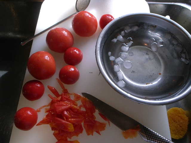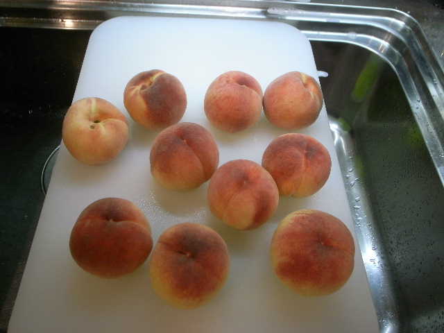おじさん、フルーツ大好きですちょっと前までは、マンゴーでしたが、今は桃本当は、西瓜も食べたいんですが、アレ、でかくて冷蔵庫に入らんから困る桃は両手で包み込むように持った時が、幸せ。産毛のざらざらさらさらが気持ちイイ。尻の割れ目のような窪みが可愛い。じっと見つめると、「そんなに見ちゃぁイヤ~ん」って声が聞こえてくる。これ以上見つめていると、おじさん、段々息遣いが荒くなって、両方の親指を、ぶずぶずと割れ目に押し込みそうなので、調理にかかります可愛いお尻が10個も包丁を種に沿って、縦に一周させて、両掌全体で、くるっと半割にして、スプーンで種を穿り出します。シャンパン多めで、あとは水と、砂糖と、レモン汁を全く適当に入れて、煮てみました。あまり甘いのはイヤなんで、桃の味が判らんくなるとイヤなんで、砂糖は少しだけ。皮の色素が、溶け出して、綺麗なピンク色に成ってきましたひと煮立ちしたら、取り出して、皮をペロンと剥きます。つるつるぽたぽたで、触っていて気持ちイイです熱々も美味しい残ったお汁は、シャンパンを足して、ゼラチンでふるふるのジュレを作ります。大きな瓶に3本も出来ました。残ったお汁は、炭酸で割っても美味しかったです。昨日の夜、モンザブローさんとケイさんカップルが我が家に来てくれたんで、早速、ジュレを出しましたアイスクリームに、ブルーベリー、桃、マンゴー、藤稔って大きな葡萄に、ジュレをかけてみました。ジュレしか見えないのが、絵的には残念