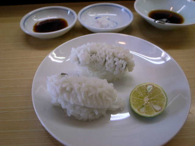 月曜日、幸寿司本店から、今週は鮎が沢山釣れましたと連絡が残念ながら、仕事の関係で名古屋へ向かう途中での連絡だったので、明日行こうと秘かに決意を固めるおじさんで、火曜日、昨日、奥さんと行ってきました。鮎が焼けるまで、散らし寿司を頼んで、その具を肴にのつもりで、ノンアルコールビールを飲んで待ちます。もちろん人肌のぬくさの玉子焼き昨日漬けたコハダ散らし寿司の種ですから、奥さんと一枚つですが、お任せでお寿司を頼むと、こんな凄い出し方をしてくれる事も在ります判りますか?コハダと胡瓜の和え物もう、こんなにコハダ食っちゃってイインですかって驚きです胡瓜の輪切りの大きさと比較しても小さいことが判ります。「え~~、こんな手間の掛かったモンを、こんなだだくさもない食い方したらバチが当たりますよ~」 「それが判って貰えりゃ充分だわ」ってお言葉、痛み入ります散らし寿司の時に、必ずお願いする煮イカ今回は、モンコウイカの太いゲソ来ました、亀尾島川の黄金の鮎凸凹した皮膚の下に、豊饒な香の熱気爆弾が坂手島の雲丹木箱に乗った雲丹より、爽やかで旨~~~~い賄いのおからおからには、おじさん、ちょっとウルサイからね大将が漬けた粕漬けをたっぷり頂き、ご馳走様でした。帰り道、次回は、酢飯じゃなくて、白いご飯に、焼き鮎と大将の漬けモンって頼めるかな~って、奥さんと話し合いました 来週はお盆ですが、幸寿司本店は営業してます。大将はきっと、日曜日に鮎釣りに行きます。おじさん、火曜日からお盆休みで、仕事は午前中のみ(言い換えれば、お盆休みでも、毎日、午前中は働くんです)予定が無かったら、火曜日、昼から、鮎食いながらノンアルコールじゃない、本アルコールが飲みたい