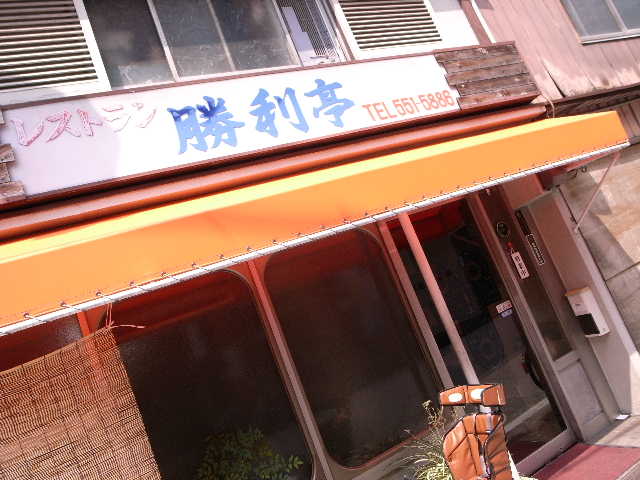 久々に、レストラン勝利亭(写真は昔の) 名古屋市西区那古野1-2-17 地図 11:30~13:30(L.O) 17:00~20:00(L.O) 水曜休み10年以上前、業界紙にB級グルメを連載していた頃、よく食べに来てた。(その連載を手直ししたのが、フリーページ「さくらとへいちゃんのB級グルメ玉子編 1 オムライスです。読んでね。)はじめてオリジナルメニューの、エビミヤビを注文なんだろう、ミヤビって?雅に通じるのか?アラッ、紙ナプキンが、只の白いのに成っちゃってる昔はちゃんと印刷されてた。もう、こういうモンに、自分ンとこの名前を印刷した別誂えを使うのは、町のレストランでは、経費的に無理なのかな~、寂しいスプーンやフォークがさ、これで、クルクルって巻いてあってねへ~~、これがミヤビかう~~~ん、なんだろうな~~~、ビーフシチュウのソースにウスターソースを足した味白いご飯にかけても、旨そう。今回は、チキンオムライス、しかも大盛りを注文ガッツリ食いたかったんだ、ここのオムライスをデ、デカッ皿からはみ出そう資生堂パーラーや、アンジュとは違い、肌荒れがひどい。焼き目のついた、黄身と白身の色ムラの在る、気取らないオムライス、上品とはいえないけど、これが素朴でいいンだな~卵3個使用が嬉しいのだんでもって、良く焼けてるように見えるが、ライスに接している内側は、ちゃんと半熟ミヤビを足して食べても旨しもう、大満腹の、大満足