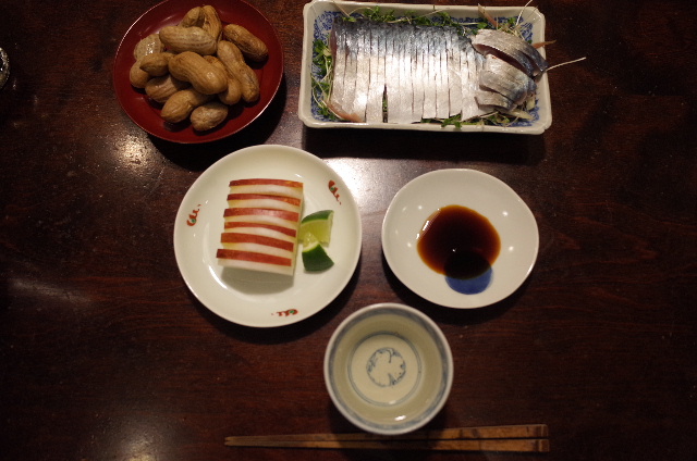 おじさん、青魚、光モン、大好きです。シンコ、コハダ、鰯、秋刀魚、鯵、鯖、鰹、鰤、鮪(大きさ順)鯖が脂がのって美味しくなって来ました〆鯖を肴に夕餉のスタート・・・幸せです脂の乗りがイイからと、3時間半塩にしたら、すこし塩っ辛い日本酒だよね酢は一時間、中は生しいです。塩と酢が、落ち着いていないんで、本当は翌日、翌々日の方が馴染んで旨いですが、そんな事はかまっていられません。ちょっと塩っ辛いんで、大根と林檎を口直しに落花生の茹でたのですが、このままだと大きさが判りませんが・・・手前が、普通に売ってるピーナッツです。デカイでしょ千葉県成田産の落花生、オオマサリという品種です。収穫時期が2週間くらいと、非常に短いそうです。塩茹で、ホクホクして美味しい食べ応えが在るから、一粒で充分味わって食べられますこれから、暫らく、〆鯖が続くおじさん家です