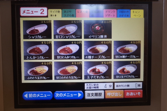 すしやのシャリカレー|くら寿司 ホームページ 北大路欣也さんから、シャリカレーにトッピングが出たよってお知らせが在りましたので、行って来ましたくら寿しさん、スターウォーズのはるか昔、一度だけ来た事が有ります。当時、何も判らず、お皿を入れる穴に、オシボリとか、冷めたお茶を入れて注意されましたこのディスプレーが、レーンの上の方に在って、見続けていると、年寄りは頚椎を痛めると思うトッピングは当然、「ふわとろ玉子カレー450円」をポチっと。カレーが来る間に、お約束の玉子焼き出汁巻き玉子で、100円としては、上出来かとただ、パネルから、コレを探し出すことが出来ず、フロアーのお姉さんにお願いしましたケーキと同じページに在るんだもん、初めての人が探せる訳が無い山葵にも、こだわっています。「贅沢に使った」って事は、100パーセント本山葵とは違うんですか?「本格」生わさびと書いて在るけど、「本」山葵とは違うんですか?あんまし聞いてはいけない?どこで食べても安心の、イカを注文魚魚丸に比べると半分の大きさですが、ちゃんとイカしてます赤身、うっすいです~~~、宇津井健イカと比べると、口の中ですぐ無くなっちゃうので、赤身を食ったぞって満足感も、宇津井です来ました、シャリカレールーは、かなりどろっとして濃厚です。ルーに具は有りません。最初甘く、じんわり辛さが迫ってきます。・・・おじさん、カレーの香と、温かくて甘い酢飯の香りが混ざったのが、ちょっと苦手でした。ふわとろ玉子も、なんか違うな~~~って気がします。おじさんは、普通の白いご飯がいいかな。もちろん、それでは、寿司屋のカレーに成らないからダメですけど。カレーは、やっぱりココ壱です。(って、比較がソコか)どちらにしても、量が多すぎて、コレを最初に食べたら、もう、お寿しが食べられないと思います。北大路欣也さん、ハーフサイズを作ったら、また、教えてね